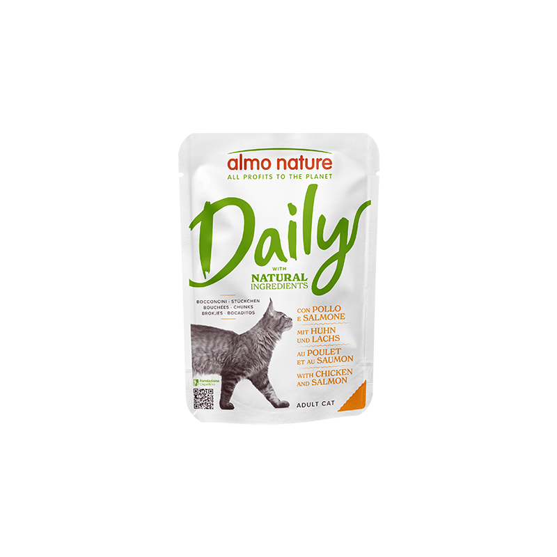 Linia Almo Nature Daily to odpowiedź na potrzeby opiekunów, którzy szukają wysokiej jakości karmy do codziennego stosowania w przystępnej cenie. Receptura z kurczakiem i łososiem łączy w sobie to, co najlepsze w mięsie drobiowym oraz rybach morskich. Dzięki starannie dobranym składnikom, saszetka dostarcza wszystkich niezbędnych substancji odżywczych, które pozwalają kotu zachować witalność i doskonałą kondycję fizyczną każdego dnia.