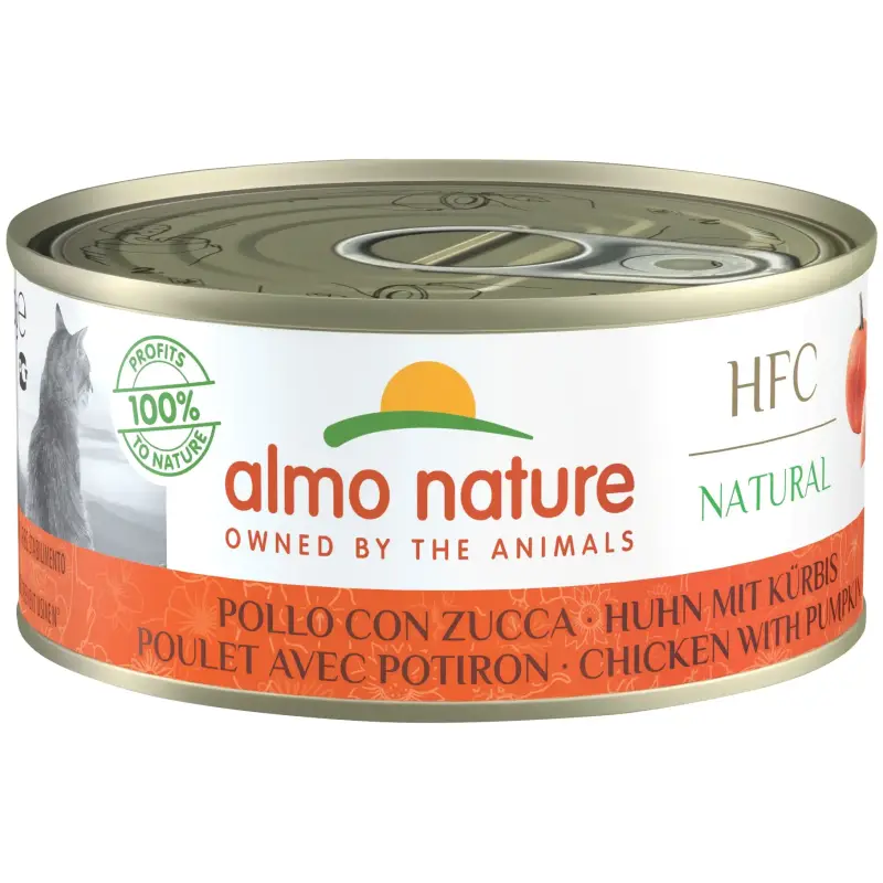 Zadbaj o sprawne trawienie i wyśmienity posiłek swojego kota! Almo Nature HFC Natural to wyjątkowe połączenie soczystego kurczaka (55%) oraz delikatnej dyni (5%) zanurzonych w aromatycznym bulionie. Wykorzystane składniki są jakości HFC (pierwotnie przeznaczone do spożycia przez ludzi), co gwarantuje najwyższą biodostępność białka. Dynia, jako naturalne źródło błonnika, wspiera pracę jelit, a minimalna zawartość tłuszczu (0,5%) czyni posiłek lekkim i zdrowym. Wybierz czystą naturę w ekonomicznej puszce 150g – bez konserwantów i sztucznych dodatków!