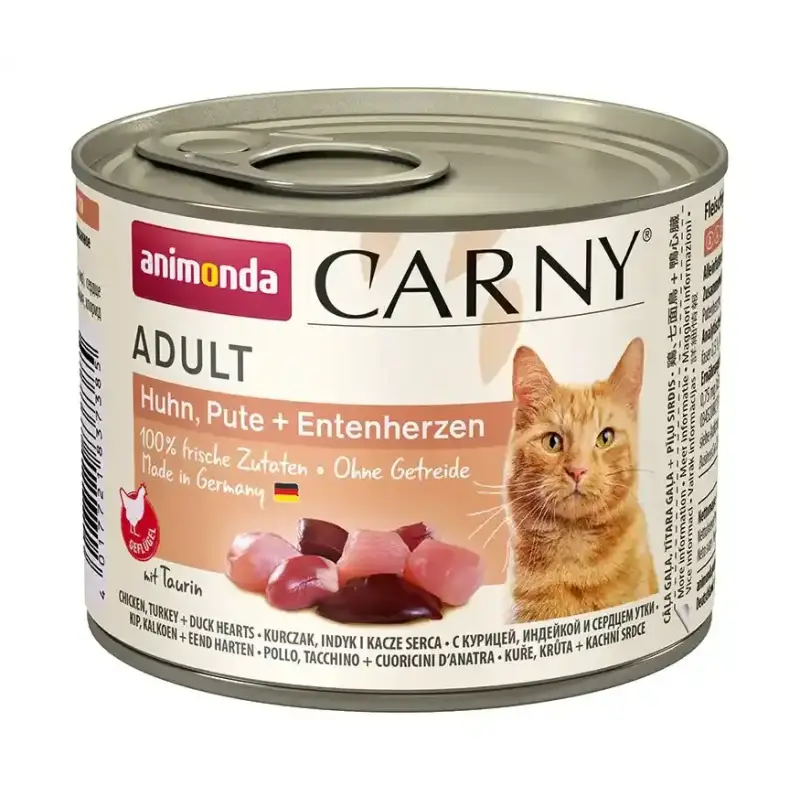 ANIMONDA Carny Adult Cat Kurczak, Indyk, Kacze Serca 200g to pełnoporcjowa mokra karma dla dorosłych kotów, oparta na wysokiej zawartości składników pochodzenia zwierzęcego. Receptura odpowiada biologicznym potrzebom kota jako bezwzględnego mięsożercy – bez zbóż i zbędnych wypełniaczy.
