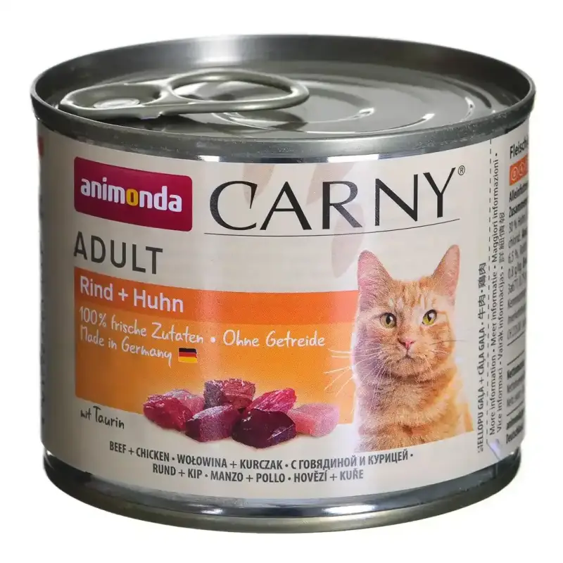 ANIMONDA Carny Adult Cat Wołowina Kurczak 200g to pełnoporcjowa mokra karma dla dorosłych kotów, oparta na wysokiej zawartości składników pochodzenia zwierzęcego. Receptura została opracowana zgodnie z biologicznymi potrzebami kota jako bezwzględnego mięsożercy.