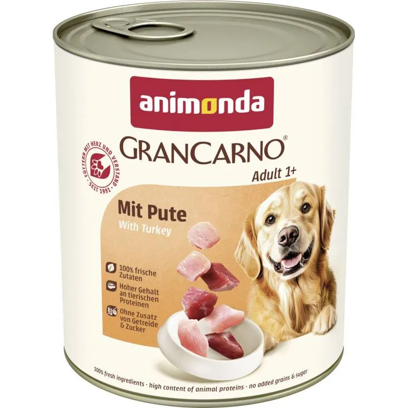 ANIMONDA GranCarno Adult z Indykiem 800g to pełnoporcjowa mokra karma dla dorosłych psów wszystkich ras. Receptura oparta jest na wysokiej zawartości składników pochodzenia zwierzęcego, co zapewnia naturalne źródło białka i doskonałą smakowitość każdego posiłku.