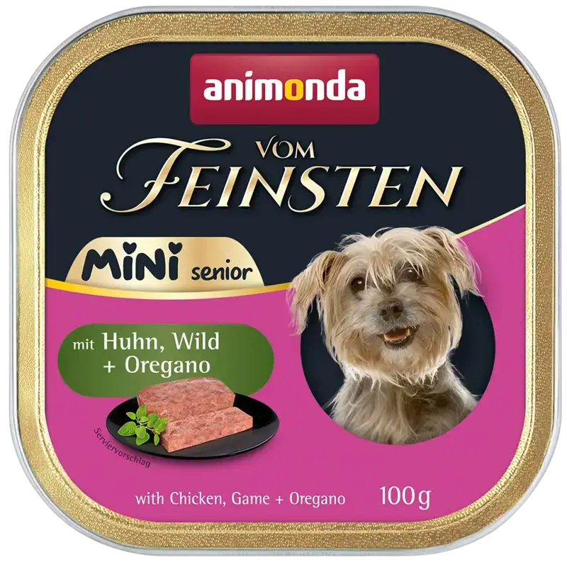 ANIMONDA Vom Feinsten Mini Senior kurczak, dziczyzna, oregano 100g to pełnoporcjowa mokra karma dla psów małych ras w wieku senioralnym. Wysoka zawartość mięsa oraz dodatek dziczyzny i oregano zapewniają wyjątkowy smak i zbilansowaną dietę. Receptura wspiera codzienną kondycję starszego psa.