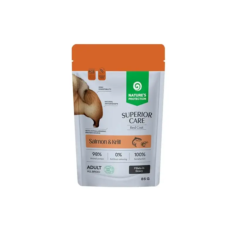 Nature's Protection Superior Care Red Coat z łososiem i krylem to specjalistyczna karma mokra zaprojektowana z myślą o psach, których znakiem rozpoznawczym jest ruda, miedziana lub brązowa sierść. Utrzymanie nasyconej barwy wymaga precyzyjnie dobranych składników odżywczych, które zapobiegają matowieniu i płowieniu włosa. Formuła ta bazuje na wysokiej zawartości ryb (łącznie 93% składników zwierzęcych w filetach), dostarczając aminokwasów niezbędnych do prawidłowej pigmentacji i zdrowego wzrostu okrywy włosowej.
